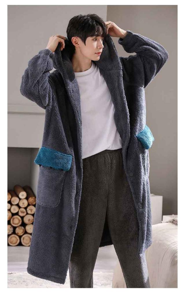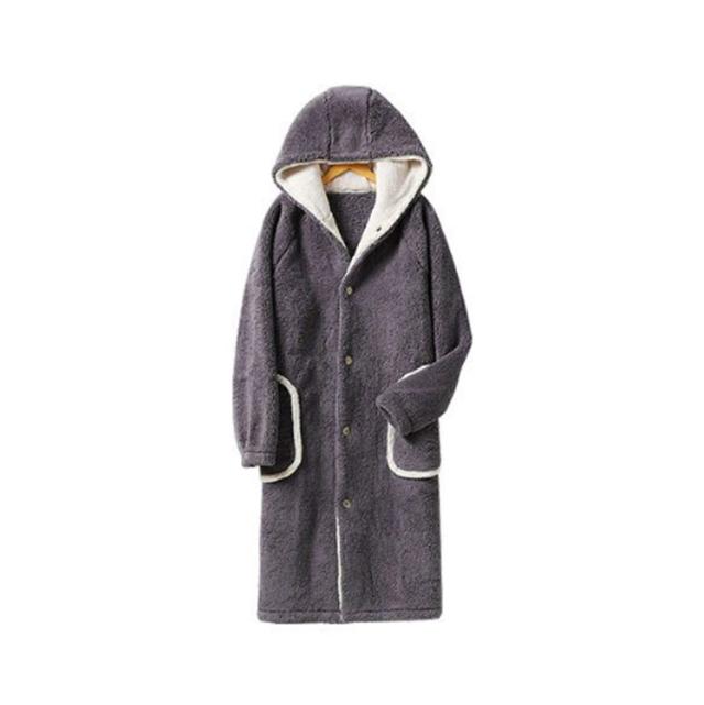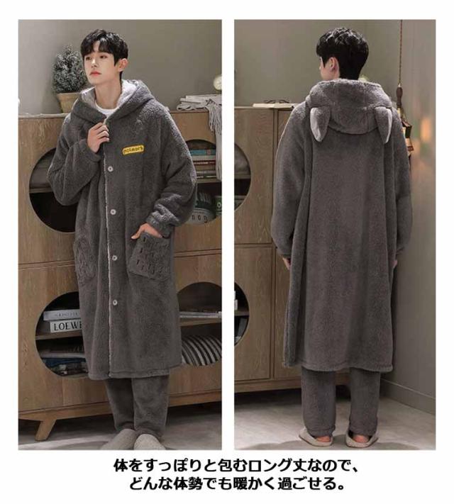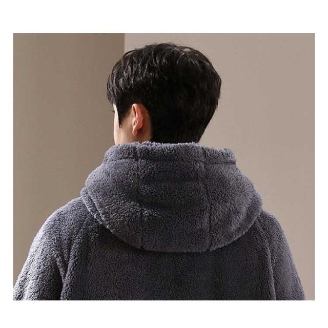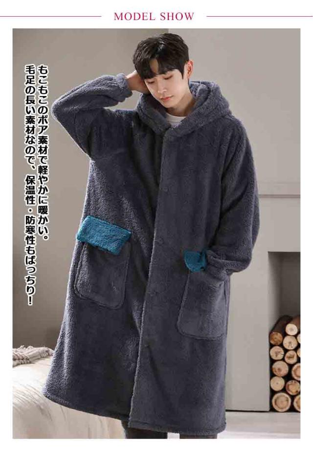 長袖 メンズ 前開き ルームウェア フード付き もこもこ ボアフリース バスローブ ガウン 部屋着 冬 着る毛布 羽織り パジャマ ボタン ロング ポケット付き 厚手 暖かい 毛布 シープボア モコモコ 防寒 保温 テレワーク 寒さ対策 シンプル