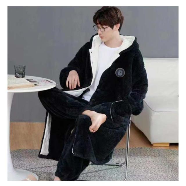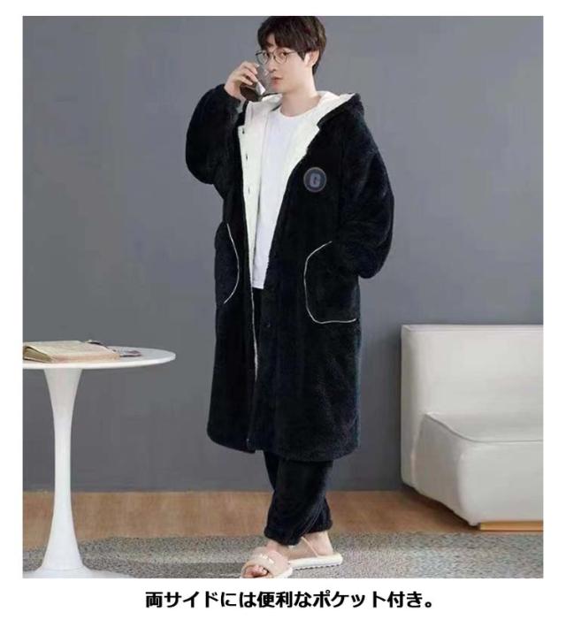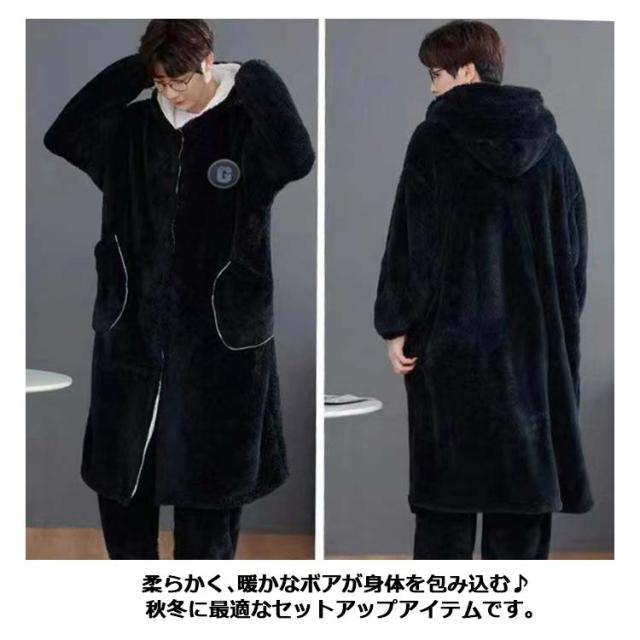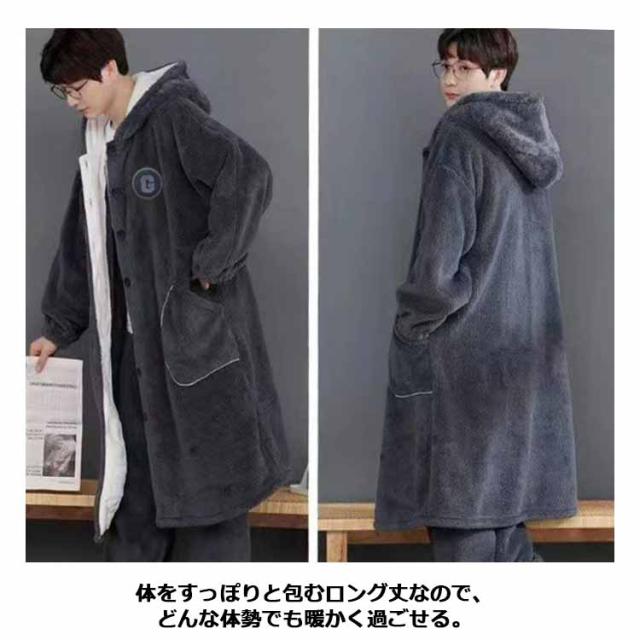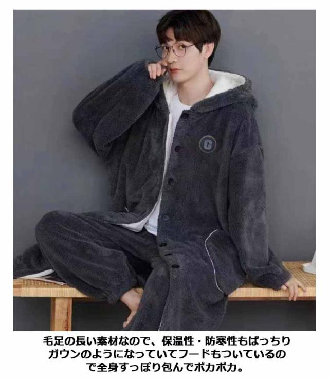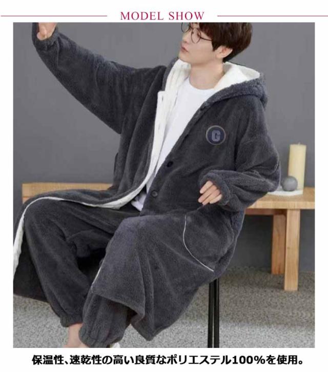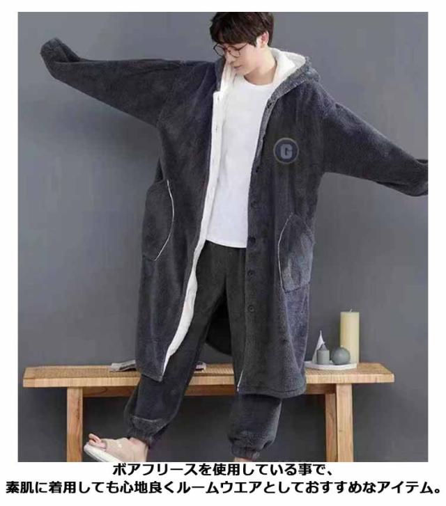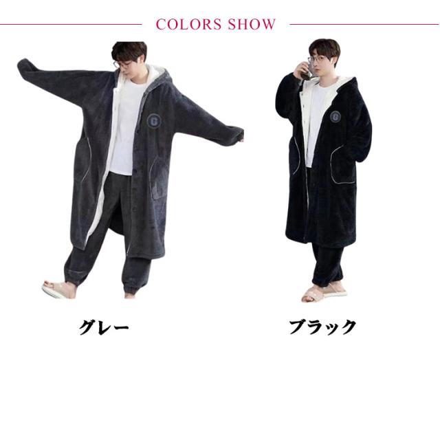 ルームウェア 上下セット パジャマ ロング ガウン 着る毛布 厚手 ボアフリース バスローブ ボタン 冬 メンズ 長ズボン 部屋着 ポケット付き もこもこ 羽織り フード付き 前開き 長袖 暖かい 防寒 保温 外出 テレワーク 寒さ対策 シンプル