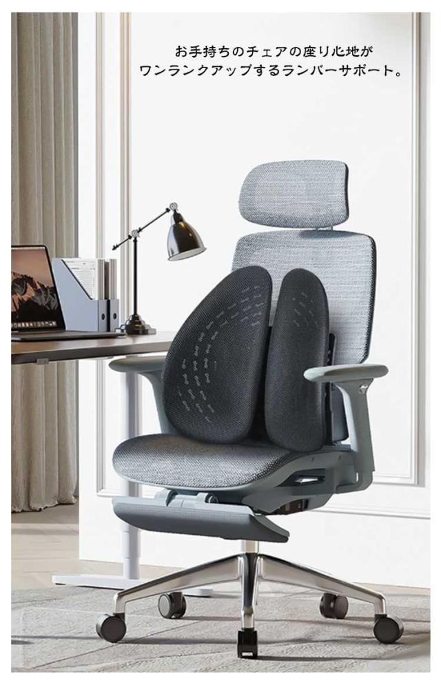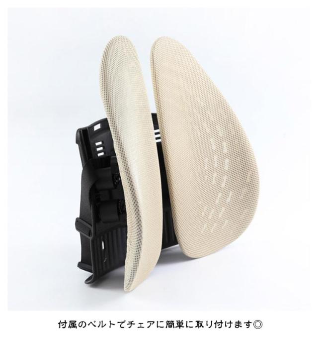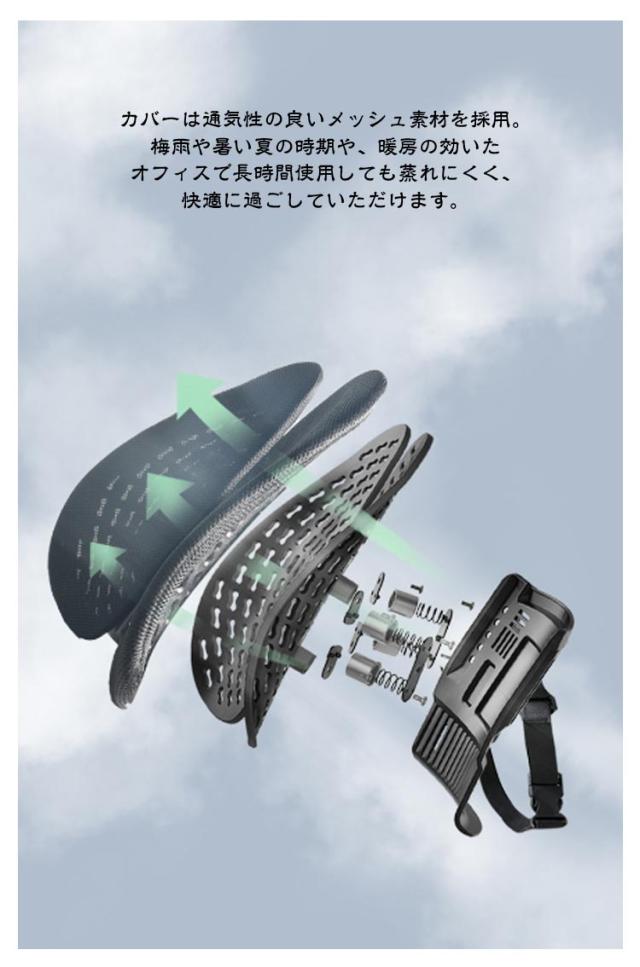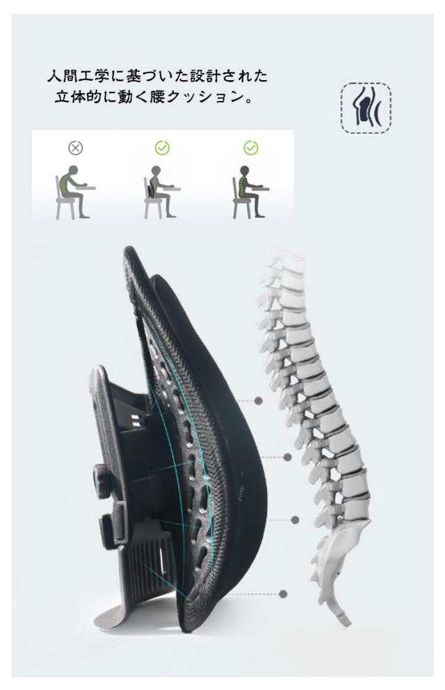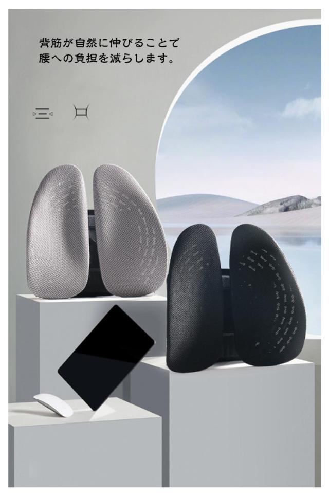 | 【商品名】背もたれクッション 【サイズ】F 【素材】ポリプロピレン、カバー:メッシュ素材 【特徴】 お手持ちのチェアの座り心地がワンランクアップするランバーサポート。 日々のオフィスワークや長距離運転などが多い方、テレワークの方など快適に座りたい方にオススメです。 人間工学に基づいた設計された立体的に動く腰クッション。 頭から腰にかけてのS字カーブをしっかり支えて、自然に正しい姿勢へと導きます。 腰をやさしく包み込みサポートすることで、体圧分散により背中への負担を減らします。効果的に体をリラックスさせます。 5段階の高さ調整可能★利用者の身長に合わせて高さを調整できて、一番心地よいバックサポートが楽しめます。 背筋が自然に伸びることで腰への負担を減らします。 カバーは通気性の良いメッシュ素材を採用。梅雨や暑い夏の時期や、暖房の効いたオフィスで長時間使用しても蒸れにくく、快適に過ごしていただけます。 付属のベルトでチェアに簡単に取り付けます◎ | |