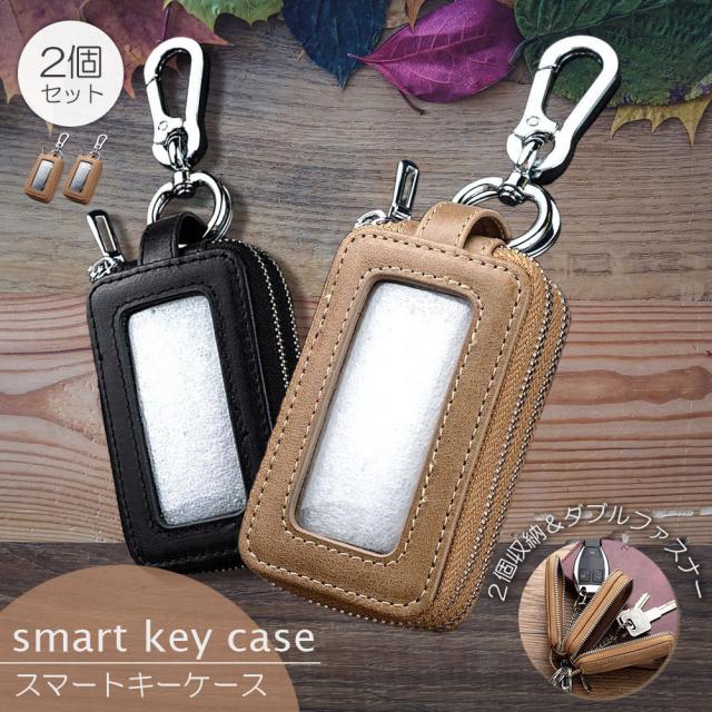 スマートキーケース スマートキーカバー 2個収納 2個セット スマートキー対応 キーケース カラビナ付き 窓付き 2色 レディース 車 メンズ キーホルダー 車キーカバー クリア窓 ダブルジッパー プレゼント ペア ダブル