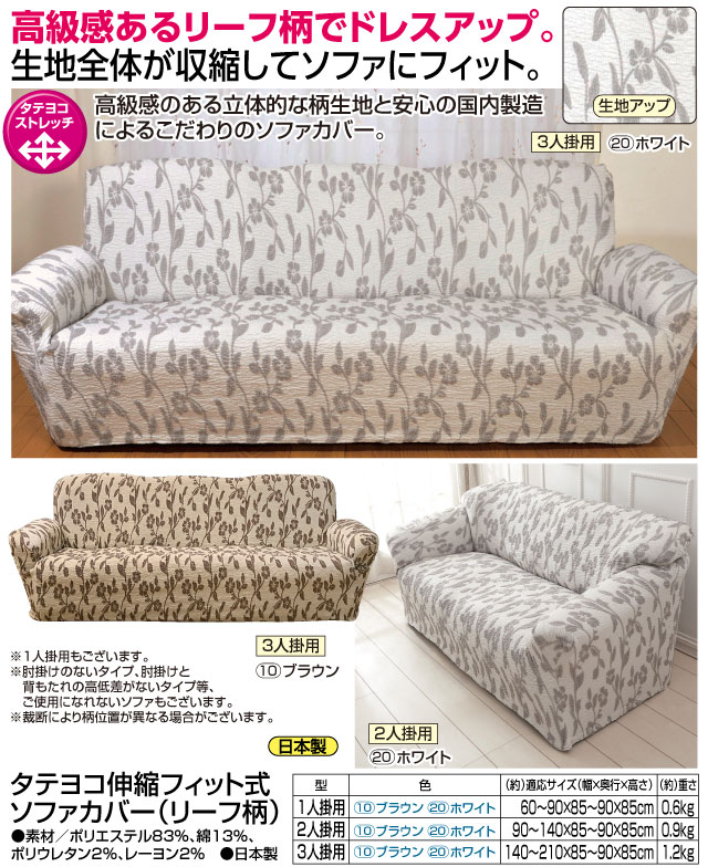 ソファーカバー ソファカバー 1人掛け用 肘付き 肘あり ストレッチ リーフ柄 タテ・ヨコ 伸縮 フィット式 ソファー カバー 日本製 送料無料