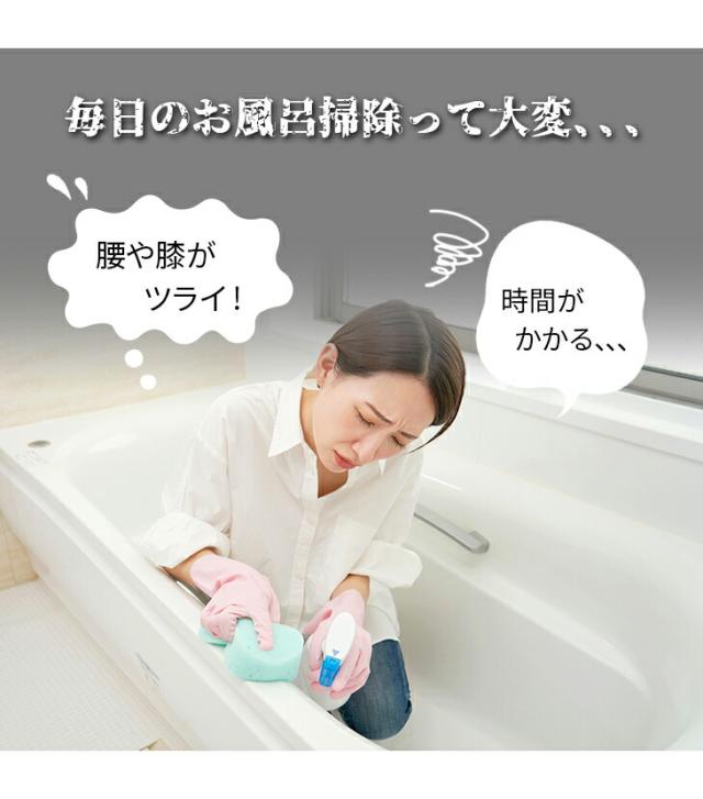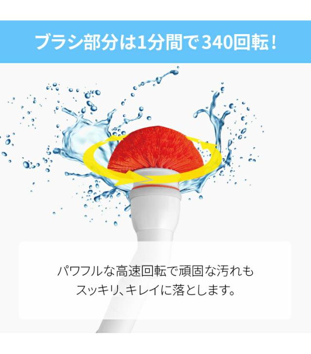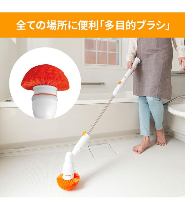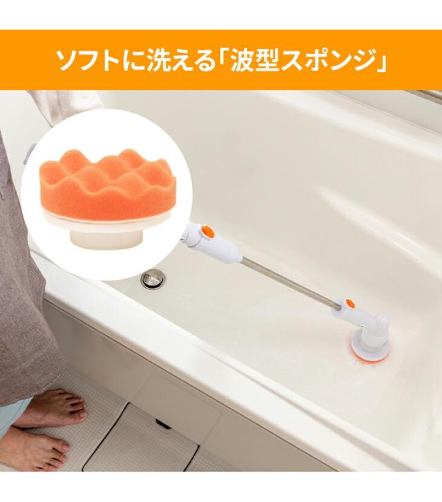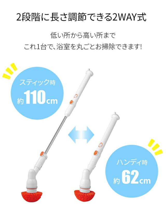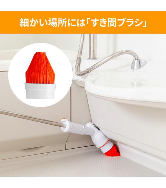 腰を曲げずに立ったままラクラクお風呂掃除できるスティックタイプの電動回転ブラシです。毎分約340回転のパワフルな高速回転ブラシで力いらずで軽々お掃除できます。ブラシの毛先を浴槽に軽くあて、ゆっくり動かすだけでスイスイお掃除。しかも軽量タイプで重さはたったの680gです。便利な充電式のコードレスタイプなので取り回しもラクラク。バッテリーはワンタッチで取り外しでき、1回の充電で約60分も使えます。5種のブラシアタッチメントで隅々までキレイに。鏡、すき間、天井や壁、床にも。長さは2段階に調節できる2WAY仕様で低いところから高いところまで浴室まるごとお掃除できます。