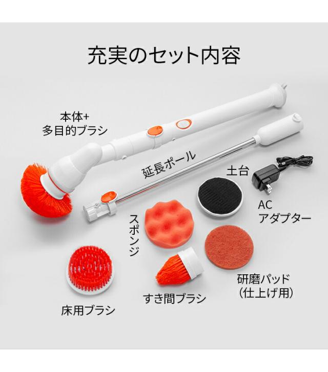 ●セット内容/本体(ヘッド・ハンドル部)、多目的ブラシ、すき間ブラシ、床用ブラシ、スポンジ、研磨パッド(仕上げ用)、土台、ACアダプター、延長ポール、バッテリー×2
