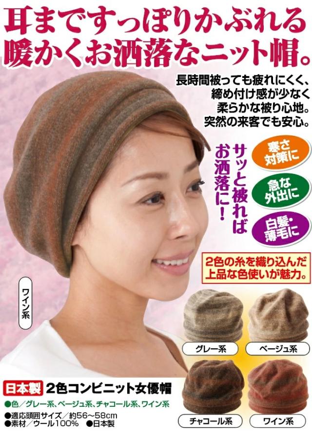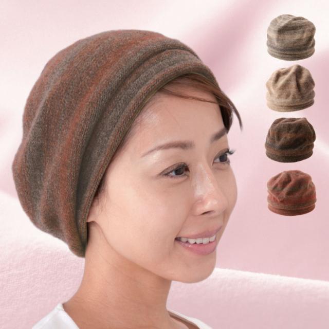 耳まですっぽりかぶれる暖かくお洒落なニット帽。長時間被っても疲れにくく、締め付け感が少なく柔らかな被り心地。突然の来客でも安心。2色の糸を織り込んだ上品な色使いが魅力。寒さ対策・急な外出・白髪・薄毛に。