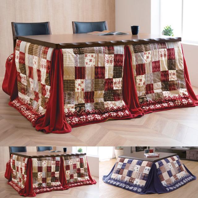 場所をとらない省スペースタイプのこたつ布団。コーナー部分がスリット仕様で裾が広がらずお部屋を広く使えます。パッチワーク調のお洒落なノルディック柄。