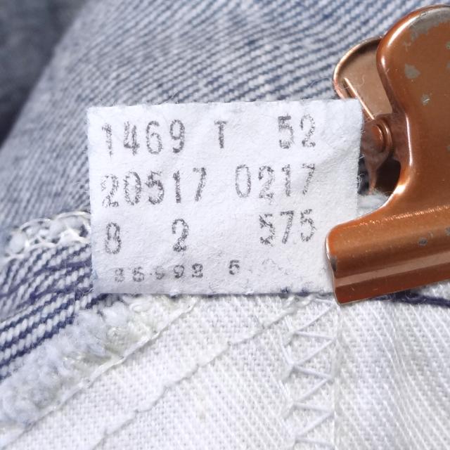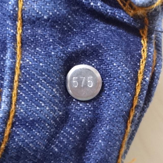 ・社名入りリベット、スモールeオレンジタブ、ジップフライ、バータック、MADE IN USA表記入りペーパーパッチ、5ポケットリベット、トップボタン裏刻印575