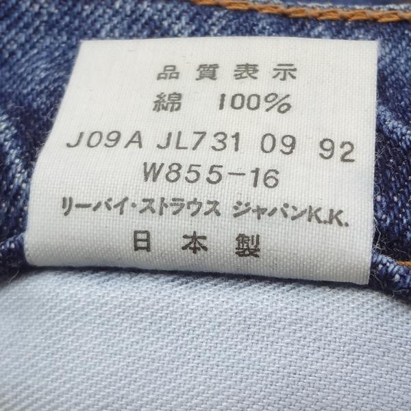 リーバイスのレディース日本製W855ワイドストレートジーンズ、実店舗の店頭展示品を1度洗濯しただけの未使用品、綿100%、1992年9月製造、ハイウェスト