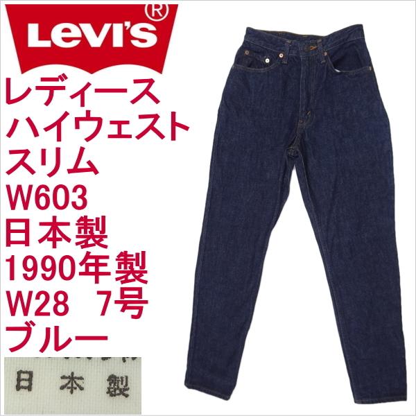 リーバイスのレディース日本製W603中古スリムジーンズ、実店舗の店頭展示品を1度洗濯しただけの未使用品、綿100%、1990年製造、ハイウェスト・洗濯済、ボタンホールやデニム生地にダメージはありません、未使用品ですが一度洗濯しているので未使用に近いで出品しています・サイズW28(7号)/ウェスト平置き30cm/股上29cm/股下74cm/裾幅15cm・スモールeレッドタブ、アーキュエットステッチ、5ポケットリベット、ジッパー使用、ペーパーパッチすそ上げ裾上げ無料MADE IN JAPAN希少貴重