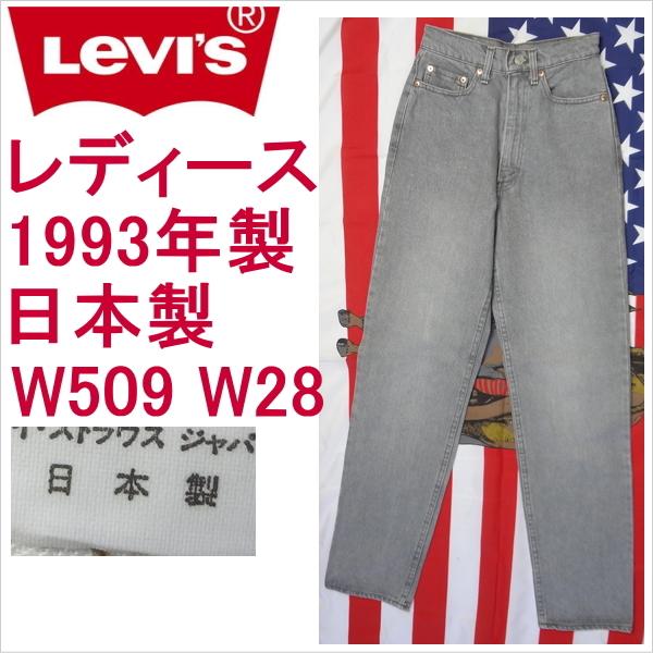 リーバイスのレディース日本製W509中古ストレートジーンズ、実店舗の店頭展示品を1度洗濯しただけの未使用品、綿100%、1993年製造、ハイウェスト・洗濯済、ボタンホールや生地に大きなダメージはありません、ひざ裏に多少色むらがあります、未使用品ですが一度洗濯しているので未使用に近いで出品しています・サイズW28/ウェスト平置き31cm/股上32cm/股下80cm/裾幅19cm・スモールeレッドタブ、アーキュエットステッチ、5ポケットリベット、ジッパー使用、ペーパーパッチすそ上げ裾上げ無料MADE IN JAPAN希少貴重
