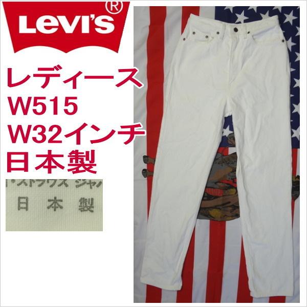 リーバイスのレディース日本製W515ストレートジーンズ、実店舗の店頭展示品を1度洗濯しただけの未使用品、綿100%、1995年2月製造、ハイウェスト、ホワイト・洗濯済、ボタンホールや股付け根にダメージはありません・未使用品ですが一度洗濯しているので未使用に近いで出品しています・サイズW32/ウェスト平置き34cm/股上33cm/股下81cm/裾幅18cm・スモールeレッドタブ、アーキュエットステッチ、5ポケットリベット、ジッパー使用、ペーパーパッチすそ上げ裾上げ無料MADE IN JAPAN希少貴重ulvsw515-220423c在庫わずか