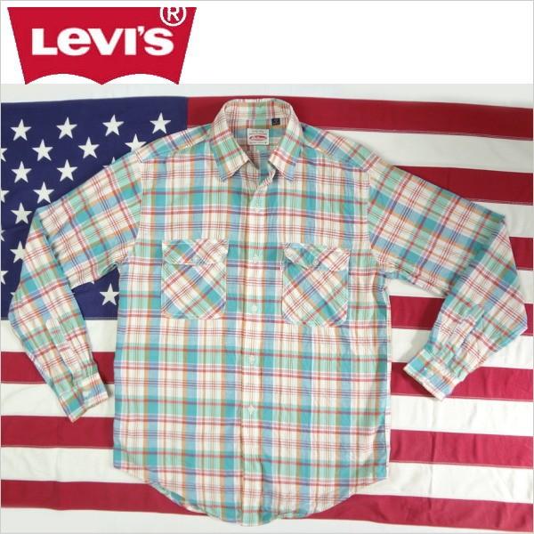 リーバイスの中古ワークシャツ、実店舗の店頭展示品を1度洗濯しただけの未使用品、素材は綿100%、薄手長袖シャツ、シャンブレーシャツ、1996年製造レアもの、スモールeホワイトタブ・洗濯済、洗いさらしです、未使用品ですが一度洗濯しているので未使用に近いで出品しています・ボタンホールや生地にダメージはありません・サイズM/肩幅47cm/裄丈86cm/袖丈61cm/身幅51cm/着丈77cmメンズ カジュアル 長袖シャツ アメカジ