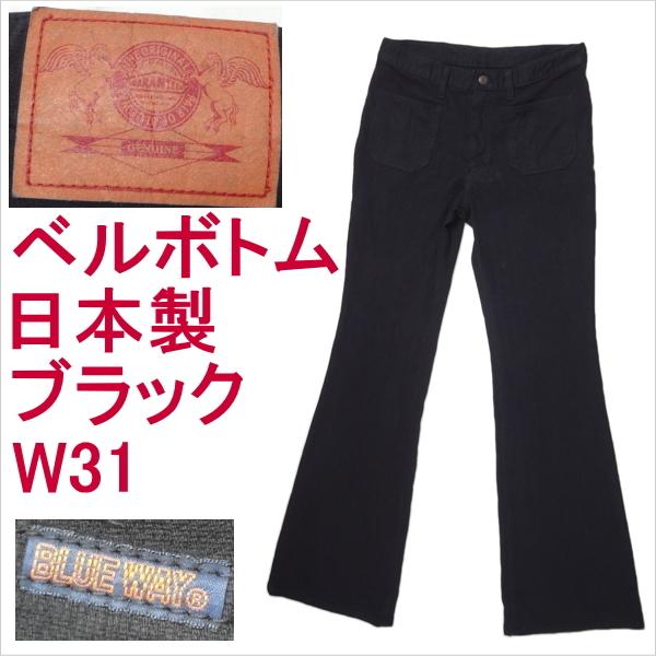ブルーウェイBLUE WAYの日本製中古ブラックベルボトムジーンズ、実店舗の展示品を1度洗濯しただけの未使用品、Gパン、ジーパン、綿100%・洗濯済、洗いさらしです・ボタンホールやデニムにダメージはありません・サイズW31/ウェスト平置き38cm/股上28cm/股下89cm/裾幅29cm・MADE IN JAPAN
