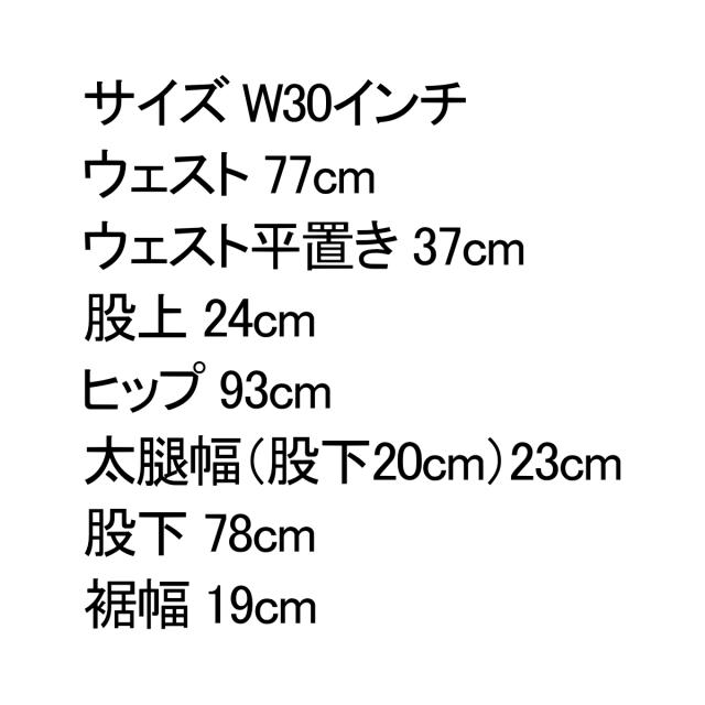 ・サイズW30インチ/ウェスト77cm/ウェスト平置き37cm/股上24cm/ヒップ93cm/太腿幅(股下20cm)23cm/股下78cm/裾幅19cm