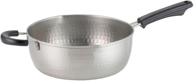 丈夫でサビにくいステンレス製雪平鍋利き手を選ばずに注げる両口タイプ高級感のある槌目模様お鍋の移動や料理の移し替えに便利な補助ハンドル付き