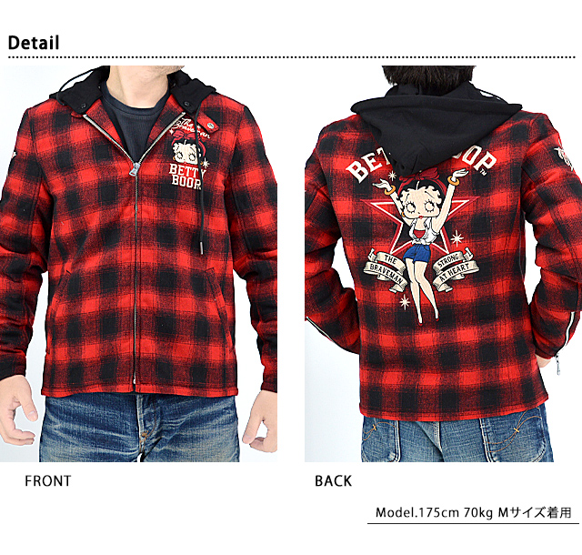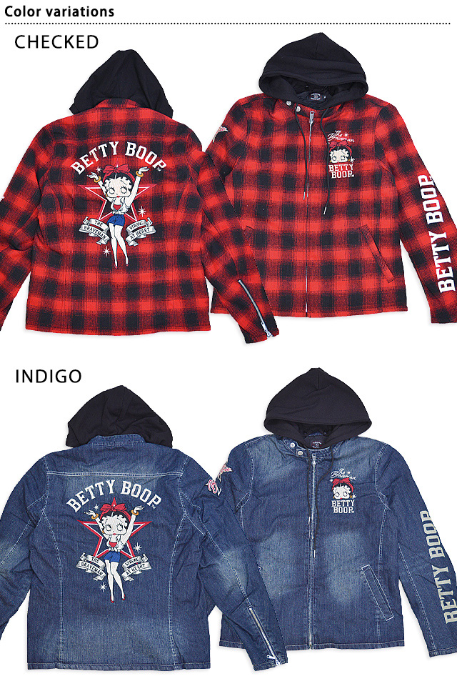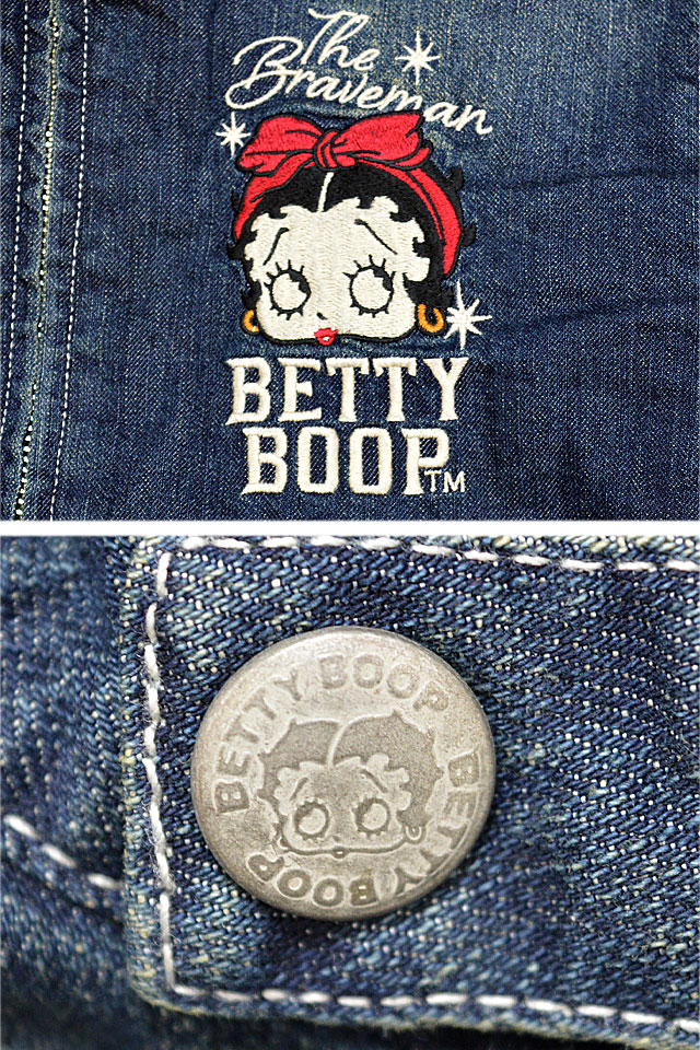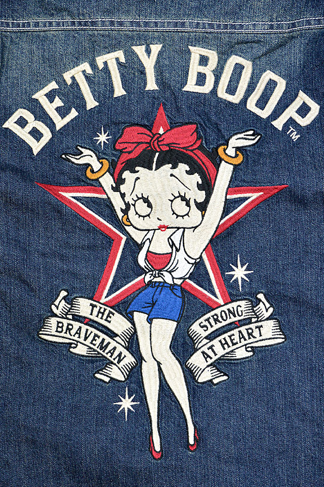 1920年代〜40年代にアメリカでワークウェアを中心とした製品を世に送り出したブランド「The BRAVE-MAN」から「BR×BETTYコラボ 中綿入りフード付きライダースジャケット(BBB-2406)」のご紹介です。 大きな瞳とぽってりした赤い唇が印象的な女の子、ベティ・ブープ(Betty Boop)。 今回はジップアップタイプのフード付きジャケットです。 ボディーにはチェック柄とデニム生地の二種類をご用意いたしました。 フロントバック共に、ベティは総刺繍でデザイン。 右袖のスターは刺繍、左袖のロゴはプリントで表現しています。 中綿入りで、寒い季節にもってこいのアウターに仕上がりました。 カジュアルに着こなしに取り入れることの出来る、大人のキャラクターアイテムです。 | |||||||||||||||||||||||||