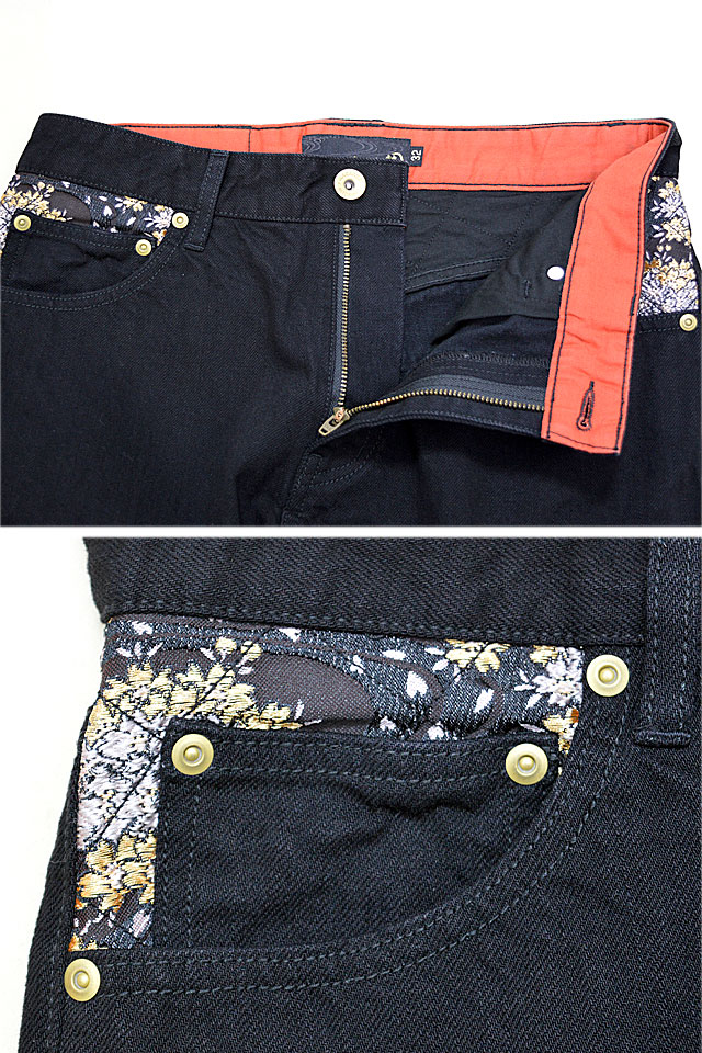 絡繰魂さんから「龍牡丹デニムパンツ(241230)」のご紹介です。 今回は龍と牡丹を組み合わせ、両腿にダイナミックに落とし込んだ、迫力満点のデザインです。 柄はフロントからサイド、バックへと繋がっており、実際に着用した際には絵柄がより立体的に浮かび上がる仕様になっています。 フロントポケット内側やバックヨークには桜柄の金襴生地を切り替え、アクセントに。 トップボタンには、ブランドロゴが刻印されたオリジナルのものを採用。 | |||||||||||||||||||||||||||||||||||