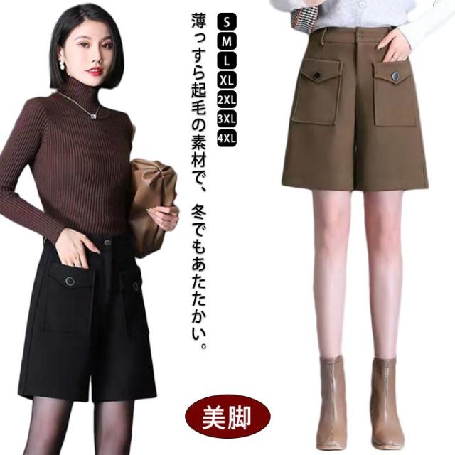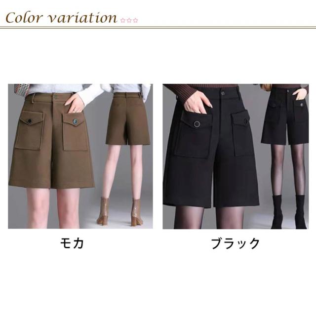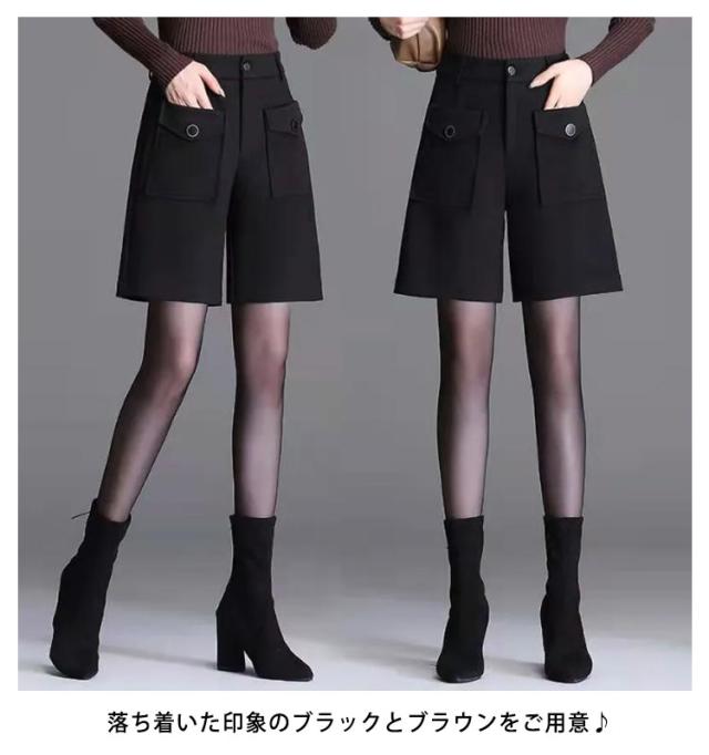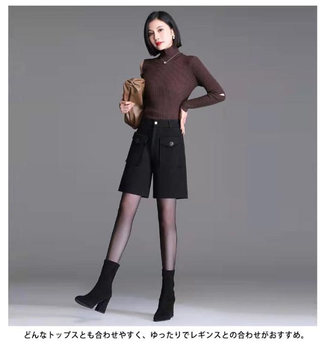 ハーフパンツ レディース ショートパンツ Aライン ハイウエスト ウールタッチ 膝上丈パンツ 五分丈 ウール調 美脚 キュロットパンツ 短パン キレイめ カジュアル ショートパンツ ゆったり 着痩せ ブラック