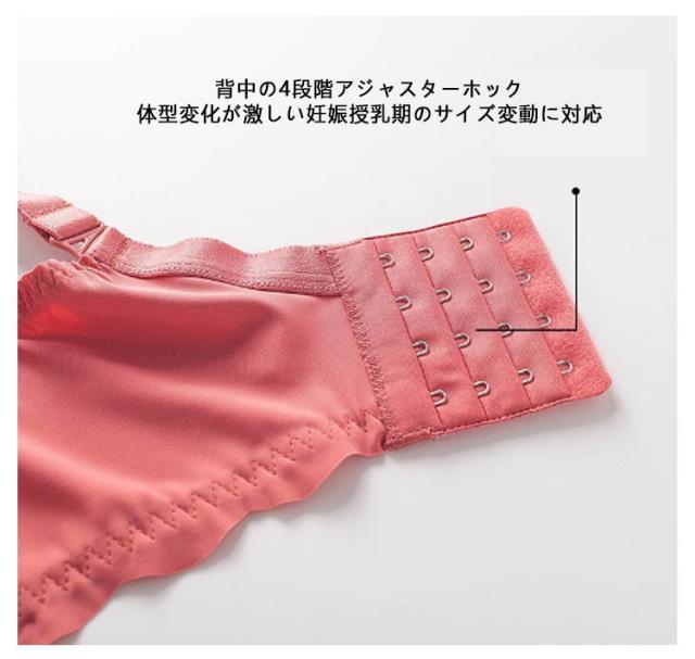 | 授乳ブラ ボタンを外すだけでらくらく授乳 フロントオープン式で、片手で簡単に開閉できます。 調節可能なショルダーストラップ お好みで調節できるので食い込みを防止できます。 背中の4段階アジャスターホック 体型変化が激しい妊娠〜授乳期のサイズ変動に対応 幅広アンダーゴム&延長ホックでつわりでも苦しくない 赤ちゃんに触れても安心・やさしい・柔らか生地 | |
