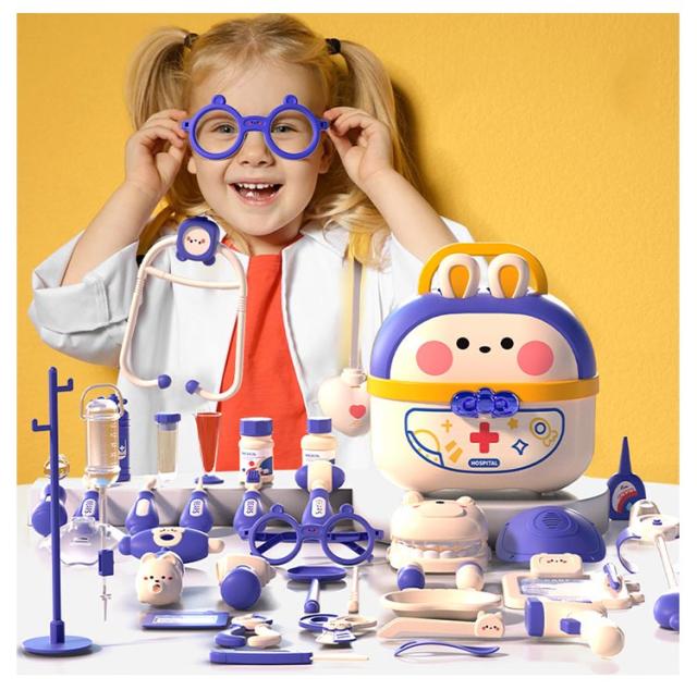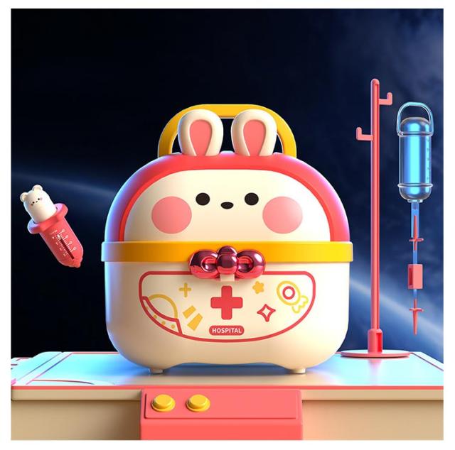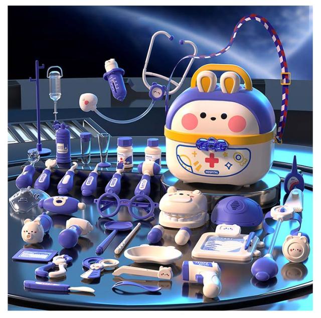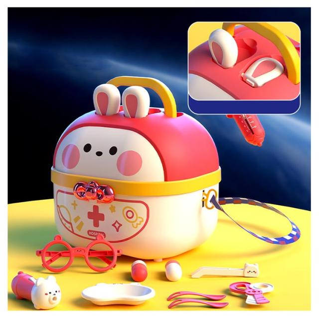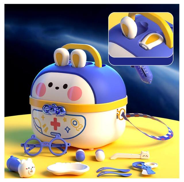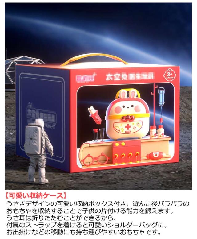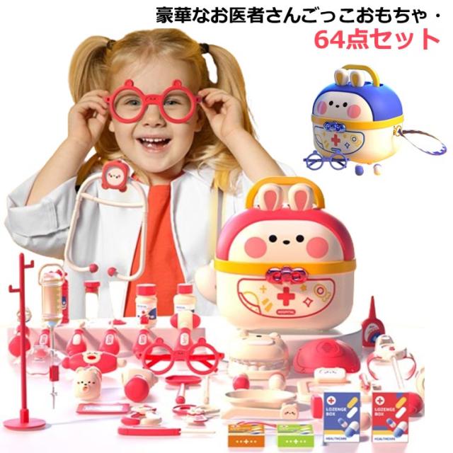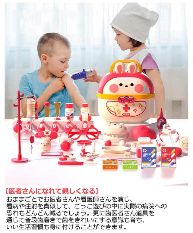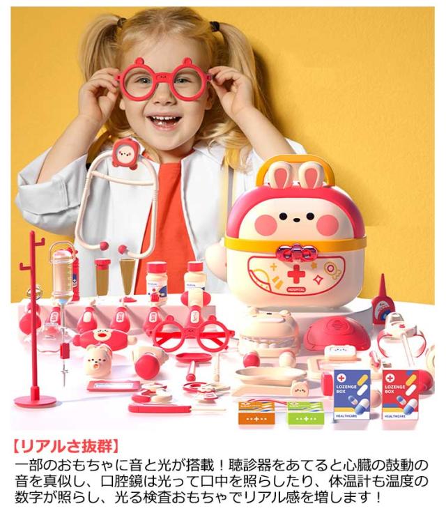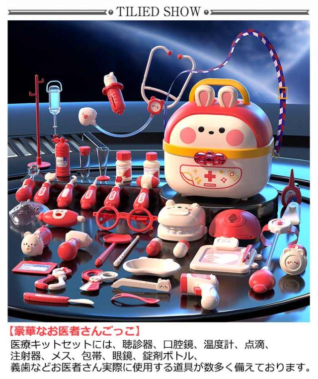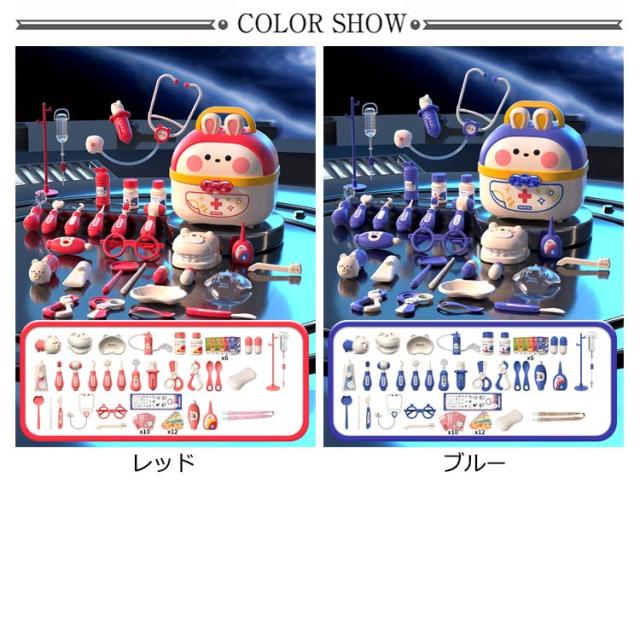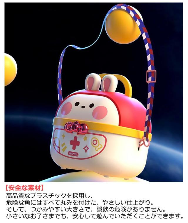 | 豪華なお医者さんごっこおもちゃ・64点セット 【安全な素材】高品質なプラスチックを採用し、危険な角にはすべて丸みを付けた、やさしい仕上がり。そして、つかみやすい大きさで、誤飲の危険がありません。小さいなお子さまでも、安心して遊んでいただくことができます。 【豪華なお医者さんごっこ】医療キットセットには、聴診器、口腔鏡、温度計、点滴、注射器、メス、包帯、眼鏡、錠剤ボトル、義歯などお医者さん実際に使用する道具が数多く備えております。 【リアルさ抜群】一部のおもちゃに音と光が搭載!聴診器をあてると心臓の鼓動の音を真似し、口腔鏡は光って口中を照らしたり、体温計も温度の数字が照らし、光る検査おもちゃでリアル感を増します! 【可愛い収納ケース】うさぎデザインの可愛い収納ボックス付き、遊んた後バラバラのおもちゃを収納することで子供の片付ける能力を鍛えます。うさ耳は折りたたむことができるから、付属のストラップを着けると可愛いショルダーバッグに。お出掛けなどの移動にも持ち運びやすいおもちゃです。 【医者さんになれて親しくなる】おままごとでお医者さんや看護師さんを演じ、看病や注射を真似して、ごっこ遊びの中に実際の病院への恐れもどんどん減るでしょう。更に歯医者さん道具を通じて普段歯磨きで歯をきれいにする意識も育ち、いい生活習慣も身に付けることができます。 | |