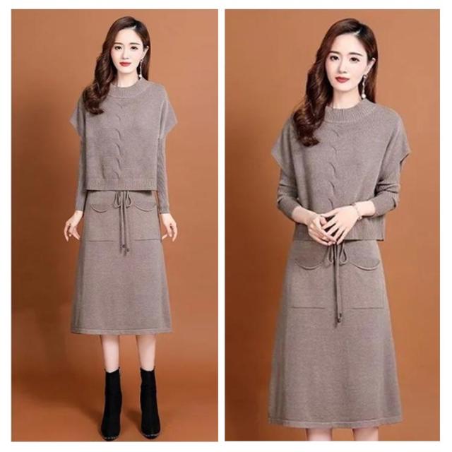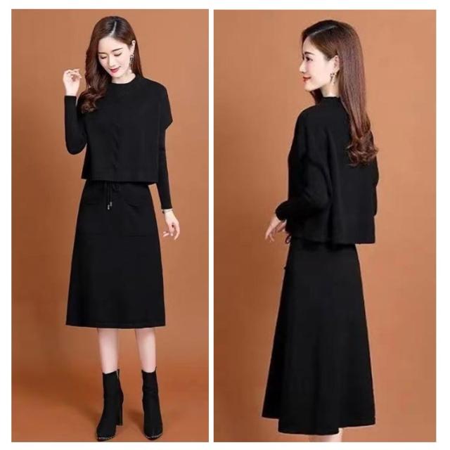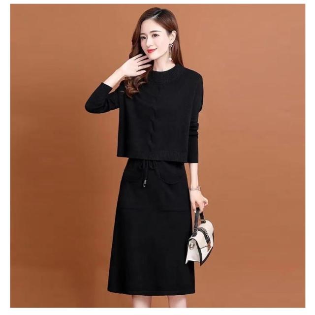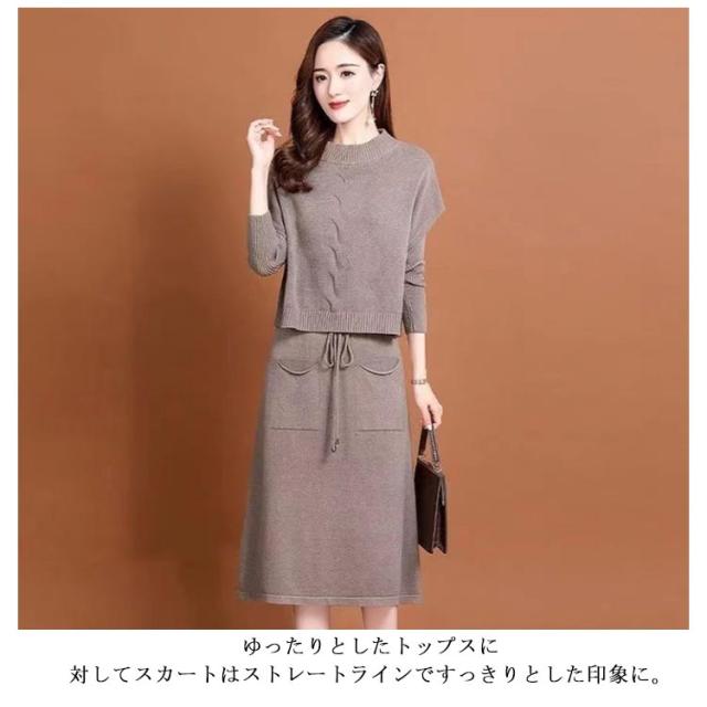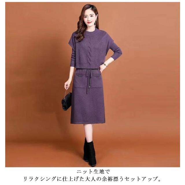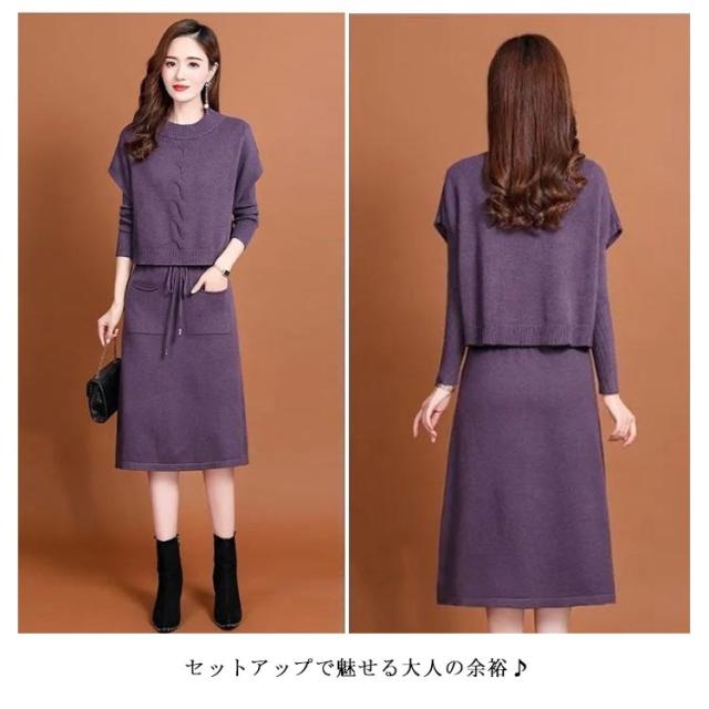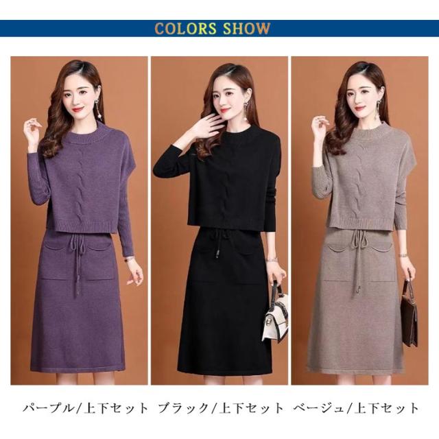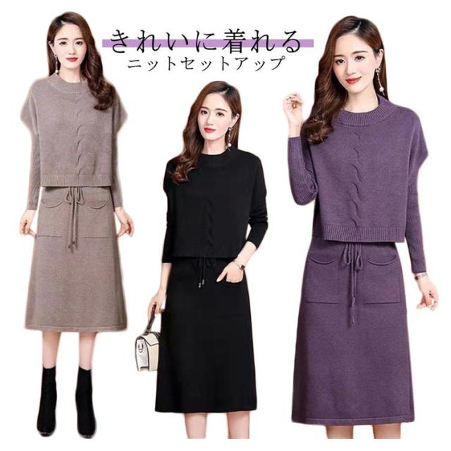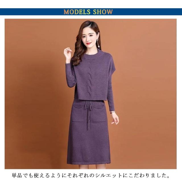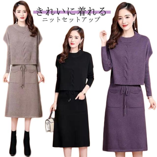 セットアップ ニット ニットセットアップ レディース セーター スカート ニットスカート 2点セット ニットセーター 長袖 大きいサイズ レイヤード風 ロング丈 ゆったり 体型カバー クルーネック 無地 シンプル 着痩せ 大人 女性 ギフト 送料無料