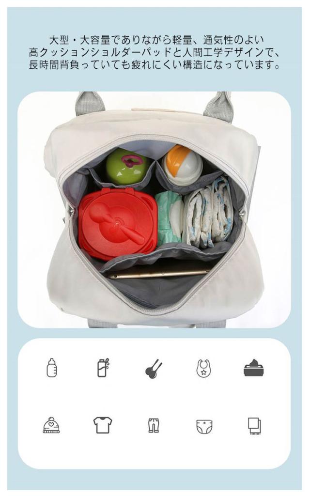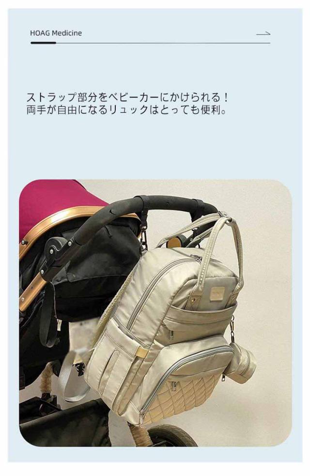| オシャレなデザインなのに、ママたちの便利さにもこだわった実用的リュックです。 お買い物、お出かけはこれ一つで!お子さんに必要な道具は全部入る優れものです。 大型・大容量でありながら軽量、通気性のよい高クッションショルダーパッドと人間工学デザインで、長時間背負っていても疲れにくい構造になっています。 ストラップ部分をベビーカーにかけられる!両手が自由になるリュックはとっても便利。 ママが使うレディースバッグでありながらも、パパバッグとしても利用できますよ。 たくさんの荷物が入りますので、育児に必要な物を常備し緊急時の防災セットとしてもお使い頂けます。 子育て奮闘中のママ達はもちろん、幅広い世代の女性が持てるおしゃれなリュックです。 | |