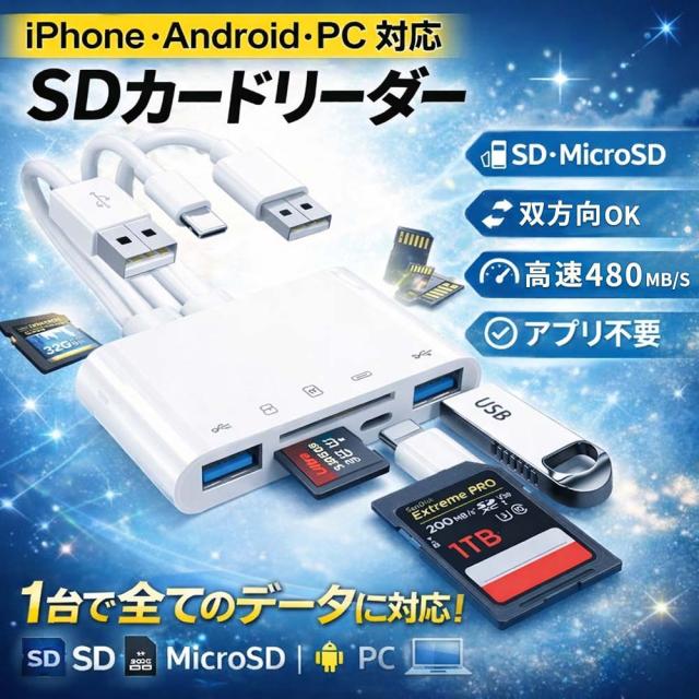 | 【簡単SDカードリーダー】 | ・iPhone・Android・パソコン・タブレットなど幅広いデバイスに対応しています。 ・SDカードやmicroSDカードを挿して接続するだけで、写真・動画・音楽などを簡単に移動できます。 ・コンパクト設計で持ち運びにも便利です。 |