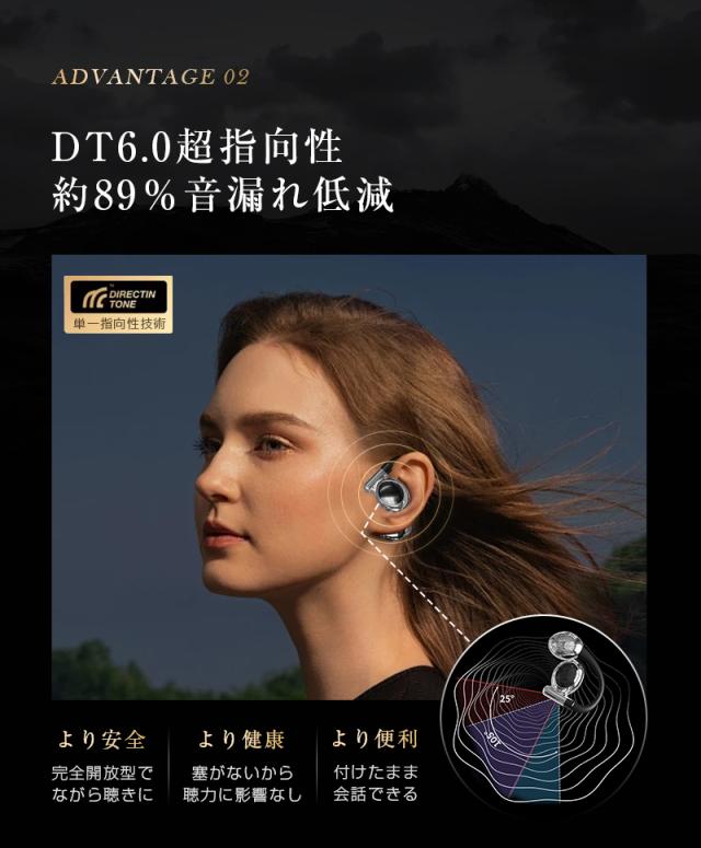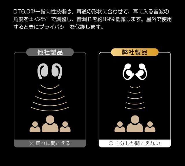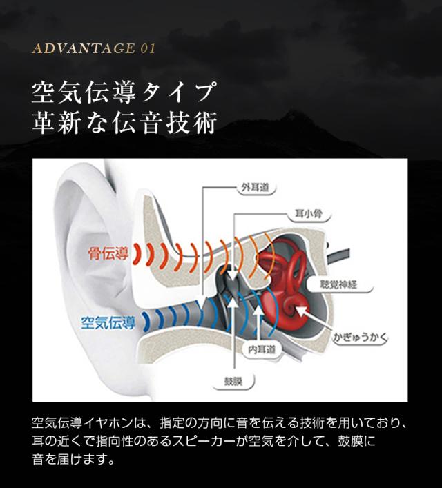 骨伝導イヤホンって、耳をふさがないから使いやすそうだけど、骨を振動させて音を伝えてるって本当…?それ体に悪影響とか無いの…?大丈夫なの?っていう人にはこの空気伝導イヤホン、おすすめです。耳の近くで超指向性のあるスピーカーが音を鳴らし、耳が空気を介して音を拾うだけです。頭蓋骨を振動させたりしない、安心してご利用いただけます。