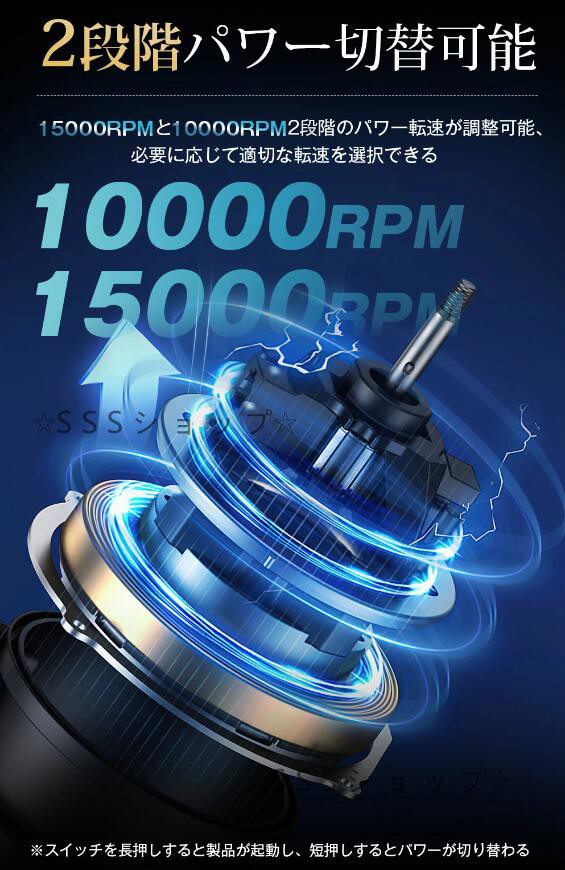 【2段階パワー切替可能】超強力モーターを搭載して、スイッチを長押しすると製品が起動し、短押しすると15000RPMと10000RPM2段階のパワー転速が調整可能、必要に応じて適切な転速を選択、急速髭剃りができて、貴重なご時間を節約します。