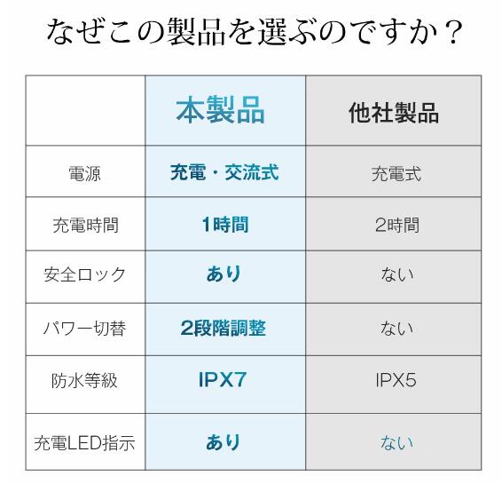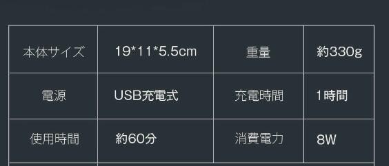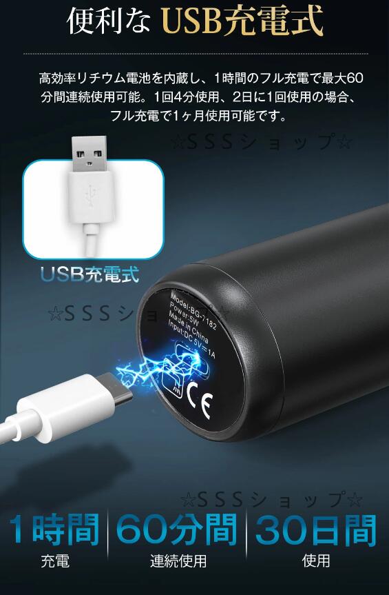 【USB充電&交流式】高効率リチウム電池を内蔵し、1時間のフル充電で最大60分間連続使用可能。1回4分使用、2日に1回使用の場合、フル充電で1ヶ月使用可能です。また、付属の充電ケーブルで充電しながらの使用も可能、使いたい時にいつでも使えます。