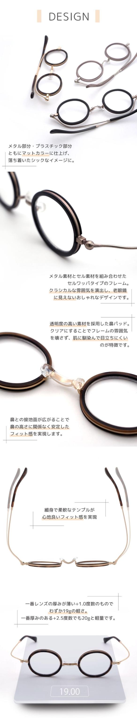 マットに仕上がったメタルとセルの異素材が高級感を漂わせ、老眼鏡とは思えないクラシカルなフレームです。