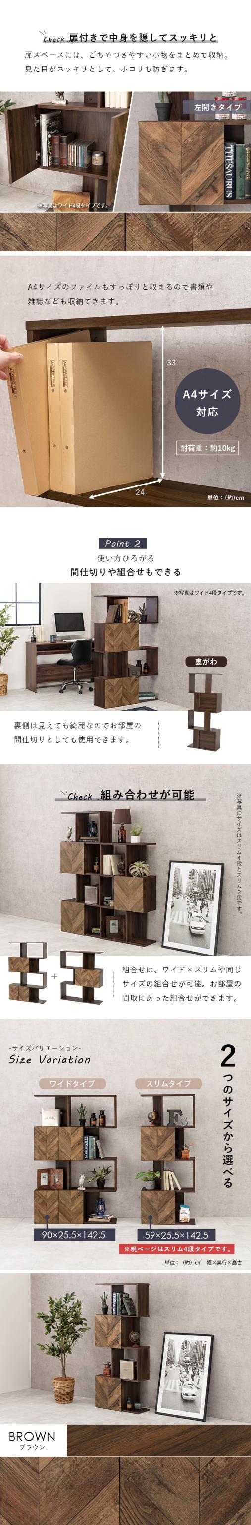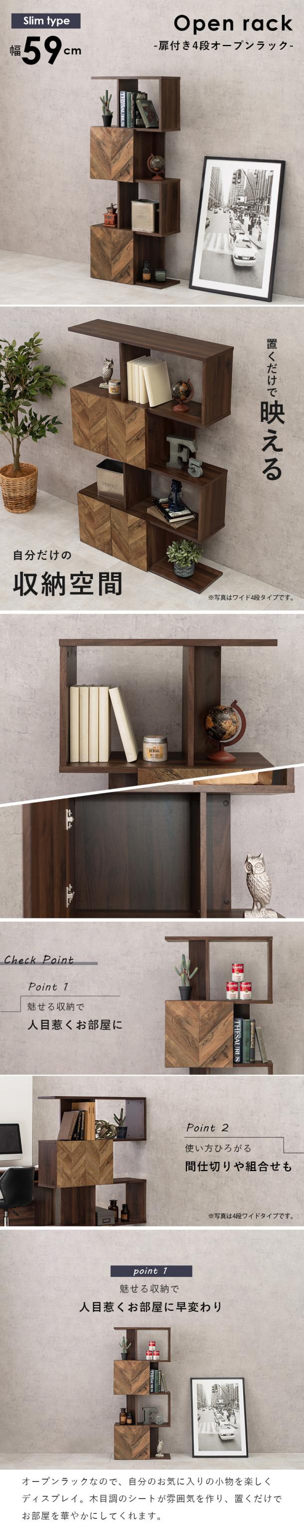オープンラック 扉付 ブラウン スリム4段 幅59cm ヘリンボーン木目調 ジグザグラック 間仕切り棚 A4本棚 組立品 Saur