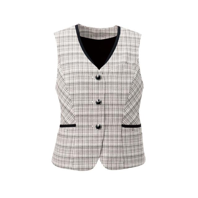 女性らしい色合いで明るく爽やかなベスト。好感度の高いベーシックなカラーにキラキラボタンでワンポイントのアクセントをきかせました。爽やかなランダムチェックを黒の配色でメリハリのあるシャープな印象に。サイドのバイヤス切替が細見え効果を発揮してくれるのでいつでも美しいシルエットなのも魅力。パッと華やぐ好印象な事務服ベストです。