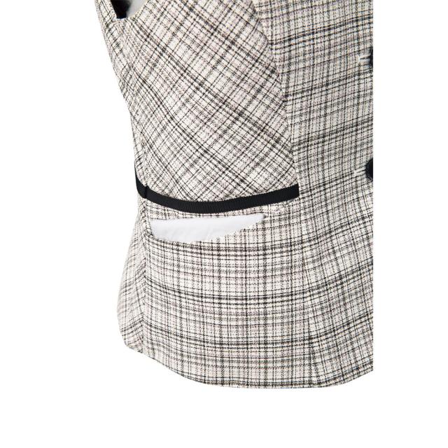 好感度の高いベーシックなカラーにキラキラボタンでワンポイントのアクセントをきかせました。爽やかなランダムチェックを黒の配色でメリハリのあるシャープな印象に。サイドのバイヤス切替が細見え効果を発揮してくれるのでいつでも美しいシルエットなのも魅力。パッと華やぐ好印象な事務服ベストです。