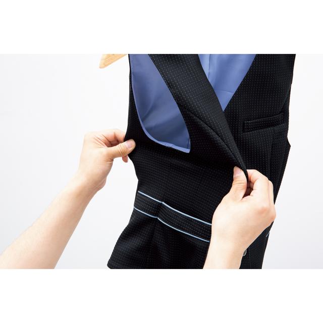 タイトなシルエットが特徴のかっこいいベストです。肉厚で凹凸感のある表情豊かなニット素材のベスト。さりげなく光沢を発しているため、全体的にツヤがあり上品でかっこいい印象に。伸縮性や柔軟性に加え、適度なゆとりと、しっかりとした安定性があるので、ウエストとバストでタイトなスリムラインシルエットを実現。ベルト風のウエストマークは全体にメリハリがあり、シェイプしたウエストラインは、ボディによりフィットし、ベストのラインを美しく保ちながら、着用していても苦しくない仕様のかっこいいベストです。
