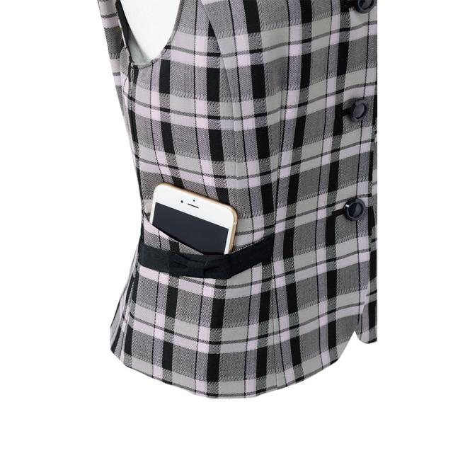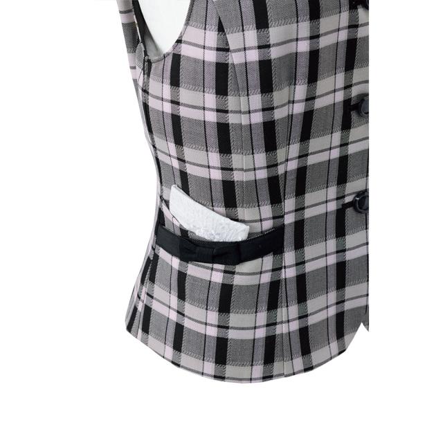 やさしいピンクに黒を効かせた大人チェック柄のベスト。2重構造になっている左右のポケットはスマートフォンがすっぽり収納でき、その上には小分けポケットをオン。斜めの入れ口、黒リボンで細見えの効果も。右内側には、印鑑専用のミニポケットもあり、収納力は抜群。サイズ調整可能なウエストベルトはリボンのカタチになっており、後ろ姿もしっかりかわいく。お花のカッティングを施したボタンなど、細部にまでこだわった完成度の高い正統派タータンチェックベストです。