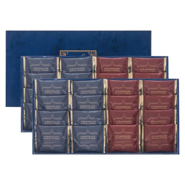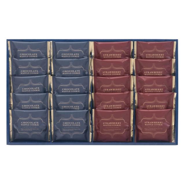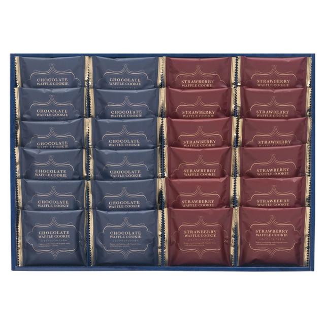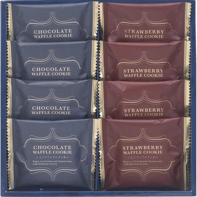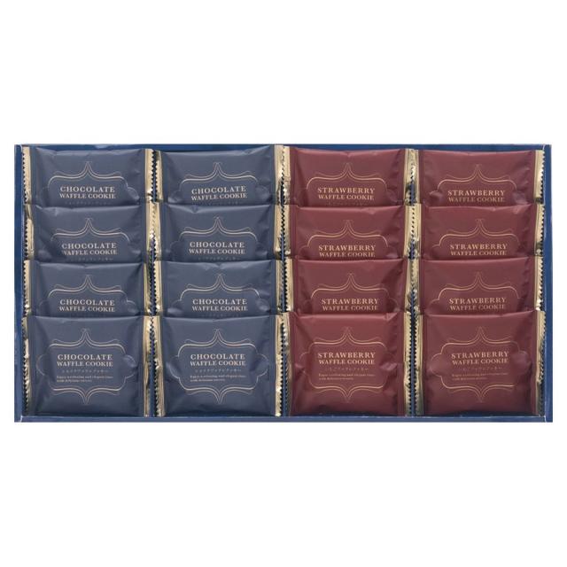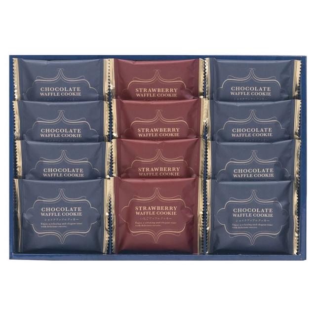 【商品について】サクサク食感のワッフルクッキーにホワイトチョコクリームを詰めた風味豊かなショコラワッフルクッキーといちごチョコクリームを詰めたいちごワッフルクッキーの詰合せです。