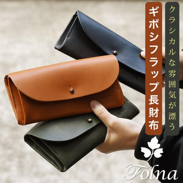 ギボシ フラップ長財布 Folna フォルナ ロングウォレット 二層式 かぶせ蓋 レディース 日本製 メイドインジャパン 姫路レザー 大容量 大きく開く アニリン染色 ヌメ革 牛革 本革 女性用 ユニセックス ブラック キャメル グリーン