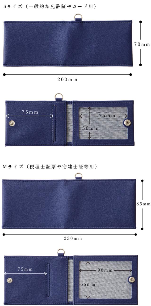 サイズは2サイズで、一般的な免許証やカードが収納できる Sサイズと、税理士証票等が収納できる Mサイズの2サイズをご用意しました。
