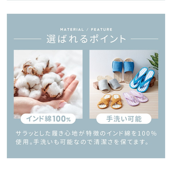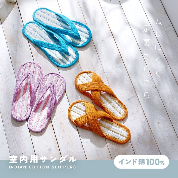 汗ばむ季節も素足でさわやか♪お風呂上がりにもぴったり!インド綿100%のさらりとした肌触りがとっても気持ちいいルームスリッパです。底のかかとにすべり止め付!手洗いOK、室内用