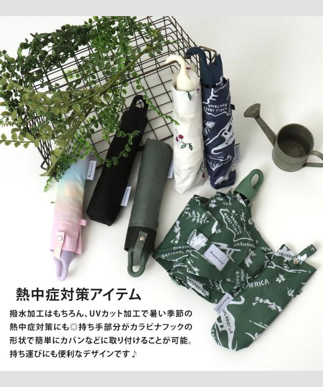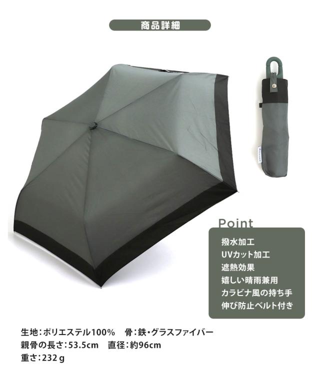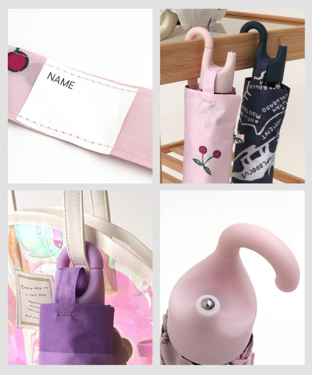 持ち手がカラビナフックの形状なので、ひねってバッグの持ち手に付けたり、机やフックに引っかけることができ、1本あると便利な晴雨兼用傘です。