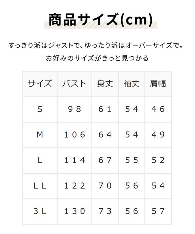 ユニセックス対応で、カップルや家族でお揃いコーデが楽しめる、S〜3Lのサイズ展開。