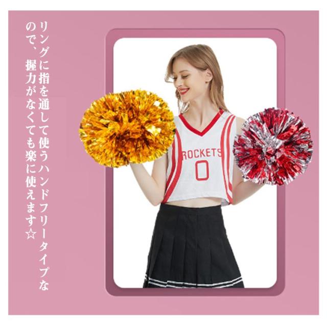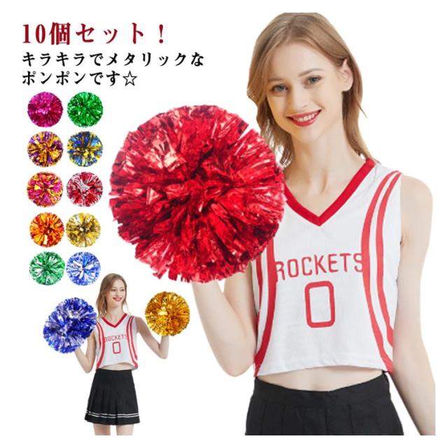 | 10個セット!キラキラでメタリックなポンポンです☆ チアダンスの小道具にピッタリなアイテム☆ リングに指を通して使うハンドフリータイプなので、握力がなくても楽に使えます☆ 運動会で踊るダンスの小道具、コンサート、応援グッズとしてもオススメです☆ | |
