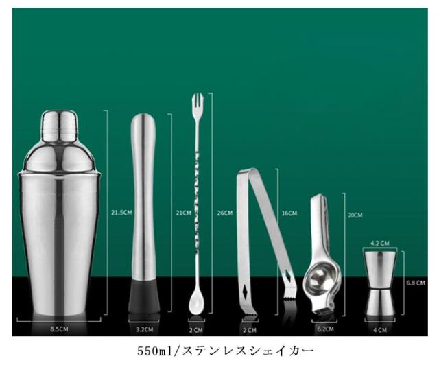 | サイズについての説明 | 6点セット:シェイカー/アイスブレーカー/マドラー/アイスクリップ/レモン絞り器/メジャーカップ |
