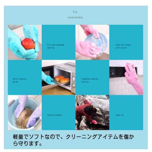 | 手のひら一面、指先までブラシ加工されているシリコン製のブラシ手袋です。 洗面所、浴槽掃除、タイルブラシとしてもよく使えます。 軽量でソフトなので、クリーニングアイテムを傷から守ります。 フック穴付きなのでフックなどにかけられて、乾燥や保管にも便利です。 指の部分と手のひらには手触りのよい柔らかなブラシ状のシリコーンが密集しているので、泡立ちがよく隅々まで汚れを落としやすくなっています。 | |