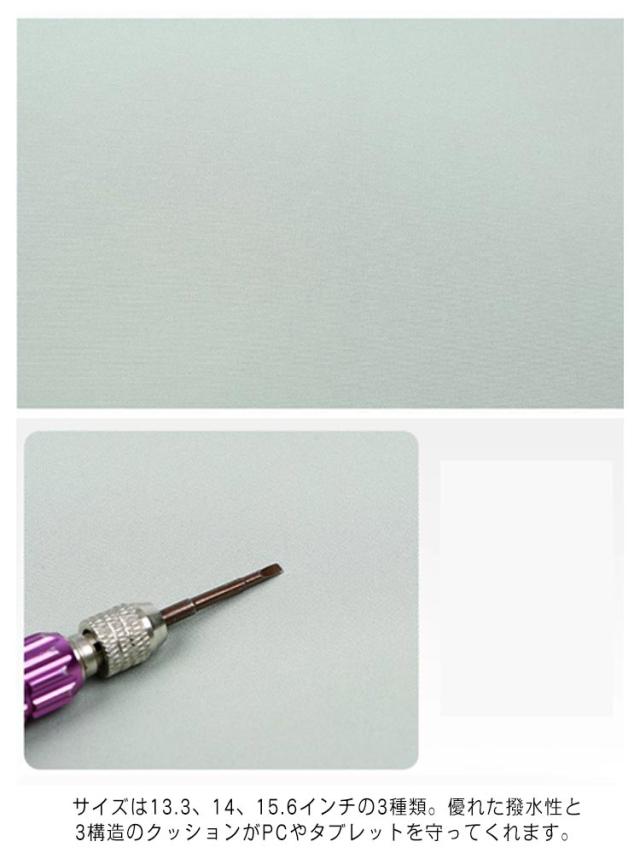 | ノートパソコンやタブレットがスリムに持ち運べるパソコンバッグ! スリムでコンパクト、バッグにいれてもかさばりにくく、カバンの中が散らかることがありません。 高い撥水性で、傷を防ぎ、通気・抗菌も兼ね備えた機能性ナイロン素材使用。 サイズは13.3、14、15.6インチの3種類。優れた撥水性と3構造のクッションがPCやタブレットを守ってくれます。 収納スペースが豊富なのでPC、タブレット、スマホ、ケーブル類を上手に収納できます。 PCインナーケースやタブレットケースとして、スリムに持ち運べます。 シンプルなデザインがかわいいので女性にもおすすめ!ipad、Macbook、surfaceに対応しています。 | |