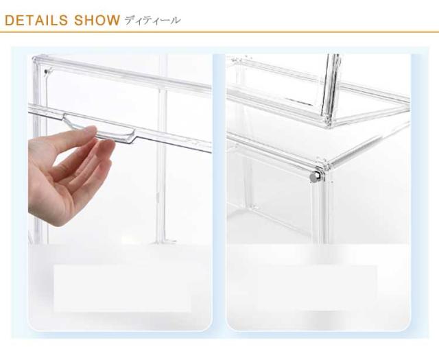 | アクリル収納ケース。2個セット【クリアな全面扉】透明な材質で観賞用としてもお使いいただけます。 【スタッキングで省スペース】ボックス同士を積み重ねて縦に収納することで、狭いスペースでもしっかり収納できます。 【大容量】大きなサイズもハイカットも余裕で収納! 【雑貨や小物入れにも♪】靴の収納以外にもお使いいただけます。コレクションボックスとして最適です。クリアな素材なので衣類や雑貨など、中身が一目で分かるので使いやすいです。 【スタイリッシュな外観デザイン】透明感抜群の高品質アクリル素材を一体成型と超音波接合で組み上げた高級アクリル製オーガナイザー。中に入れたものを一目で確認できるのでディスプレイケースとしても使用可能です。 【多機能】透明のデザインで、ケースだけではなく、かばん、本、おもちゃ、靴などが収納できます。 【多目的収納】CD収納ボックス、ゲームディスクボックス収納ボックス、本/小さなコミック収納、キャラクター人形収納ディスプレイ、モデル収納ディスプレイとして使用できます。 スタッキング可能で省スペース。 大きな収納スペースでコレクションを整頓し、手の届きやすい場所に保管できます。 【組み立て簡単】5分で組み立てられます。 長方形の構造と正確なカードスロットにより、全体がより安定し、アクセサリーが落ちる心配がありません。 1.側板を底板の側に固定します。 注意:先端にネジがついているので前に向かうようにしてください。 2.もう一つの側板を組み立てる際、ネジを前にして反対側のネジと同 じ高さ、そして同じ側にいるよう にしてください。 3.組み立てられた部分に天板を固定し、釘の板の満が裏板の頂と一致するように注意してください。 4.裏板のすべすべした側を外に向けて、組み立てた板を押して締め付けます。取り付け際、溝とパックルは揃える必要がありますのでご注意ください。 5.パネルを取り付けます。持ち手を外側にし、底部の両側の溝を底板に固定します。 6.インストールが完了。 | |
