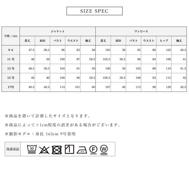 襟に滑らかなカーブを施したテーラードジャケットは、上品な中にも優しい印象を演出してくれるポイント セミフレアラインのワンピースと相まって、柔らかなシルエットのブラックフォーマルアンサンブル ワンピースはプレーンなデザインで、すっきりとした印象 フロントの切替ラインにファスナーを隠した、フロントファスナー仕様 やや高めにウエストポイントを置くことで、脚長効果もあります 袖はワンピースと同素材を使用 夏の冠婚葬祭も安心して着用いただけます 素材は濃染加工を施した、深い黒のブラックフォーマル専用生地 ご家庭の洗濯機で洗うことができる、ウォッシャブル仕様なので、お手入れが楽で、使いたいときにすぐに準備ができます 立ったときはもちろん、座ったときも膝が隠れる膝下丈 着丈105cm以上のワンピースは動きやすく、更に冠婚葬祭に適した安心感のある着丈 モデル:162cm / 9号着用 生産国:中国 |