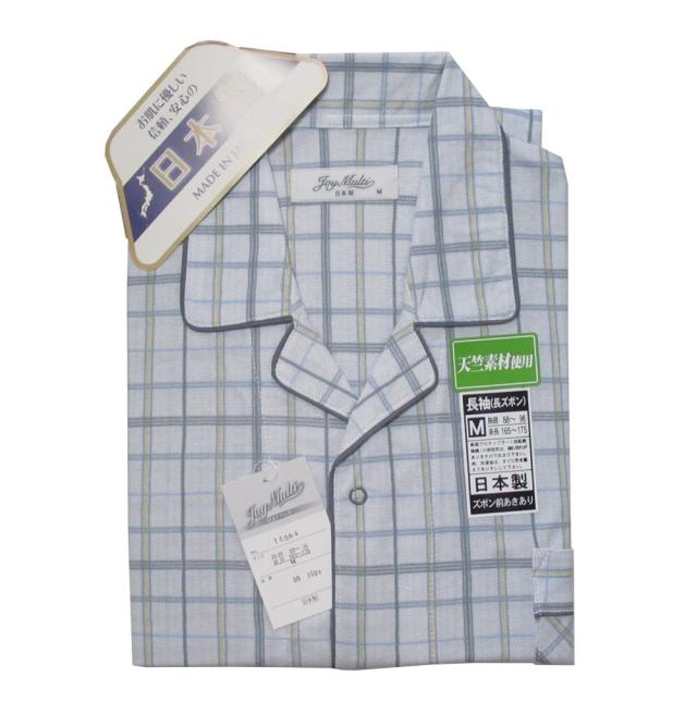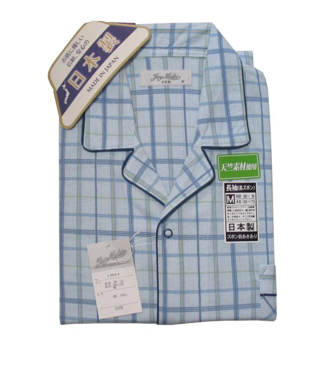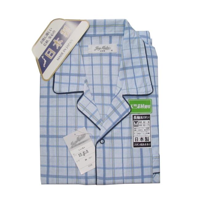 送料無料 メンズ パジャマ 紳士 ネマキ ねまき 寝間着 ズボン 前開き 総パイピング 仕上げ 格子柄 春 秋 冬 ブルー グレー サックス S M L LL 毛玉にならない 綿100% 天竺 ルームウェア ナイトウェア 日本製 14864 父の日 敬老の日 誕生日 プレゼント