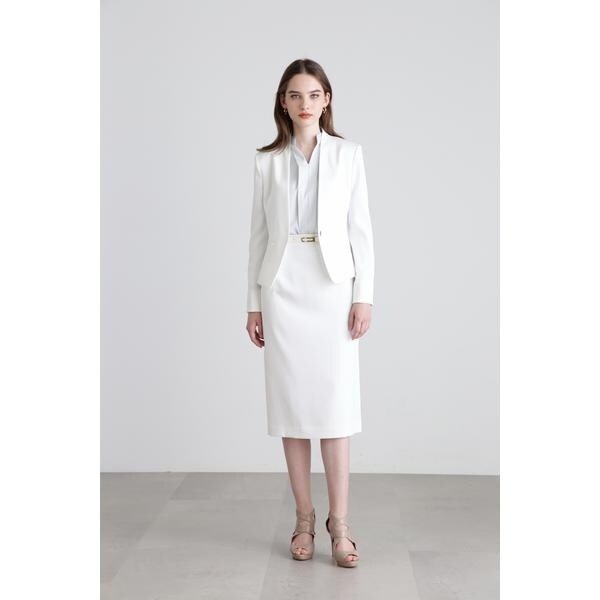 今期は、ダーツ横から流れるように施した切り替えが、美しい縦ラインを印象付けるデザインにアップデートをしています。共生地のベルトも付いているので、ウエストの調整ができるのも嬉しいポイントです。同素材のジャケットとセットアップでの着こなしもおすすめです。
