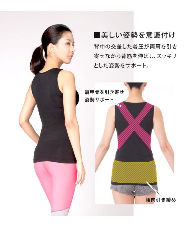 背中の交差した着圧が両肩を引き寄せながら背筋を伸ばし、スッキリとした姿勢を意識付け。